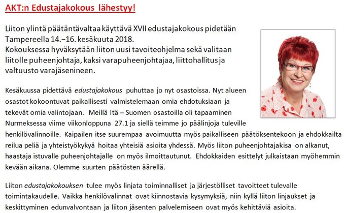 Tuleva vuosi 2018 on meille AKT:n jäsenille tärkeä ja mielenkiintoinen monella tapaa. Tärkeimpänä niistä on AKT:ssa joka neljäs vuosi kokoontuva edustajakokous, nyt kokous pidetään kesäkuussa Tampereella. Kevät menee vielä uusia mahdollisuuksia suunnitellen ja vallitsevia toimintoja tarkastellen ja myös arvioiden, missä olemme onnistuneet ja missä olisi vielä tsemppaamisen varaa. Nyt olisi viimeistään hyvä aika saada uusia toimijoita mukaan myös liiton toimintaan. Näkisin hyvänä myös henkilöiden vaihtuvuutta valtuustoon ja hallitukseen, jotta tiedonkulku ja asioiden hoito selkiytyisi ja osastojen äänet tulisivat paremmin esille kannanotoissa ja päätöksissä. Nyt koen esim. oman alueemme yhteistyön hallituksen jäsenemme kanssa olemattomaksi ja jopa meitä alueen osastoja aliarvioivaksi.