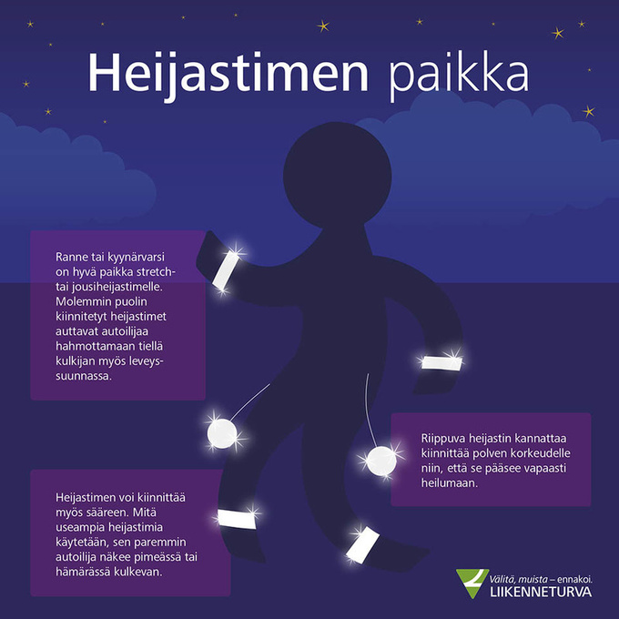 Aamulla on pimeää, illalla on pimeää eikä päivälläkään hämäryys aina poistu. Nyt viimeistään on paras kaivaa ne heijastimet esille ja myös varmistaa, että ajoneuvon valot ovat kunnossa ja jokainen kuljettaja osaa käyttää niitä oikein eri tilanteissa.